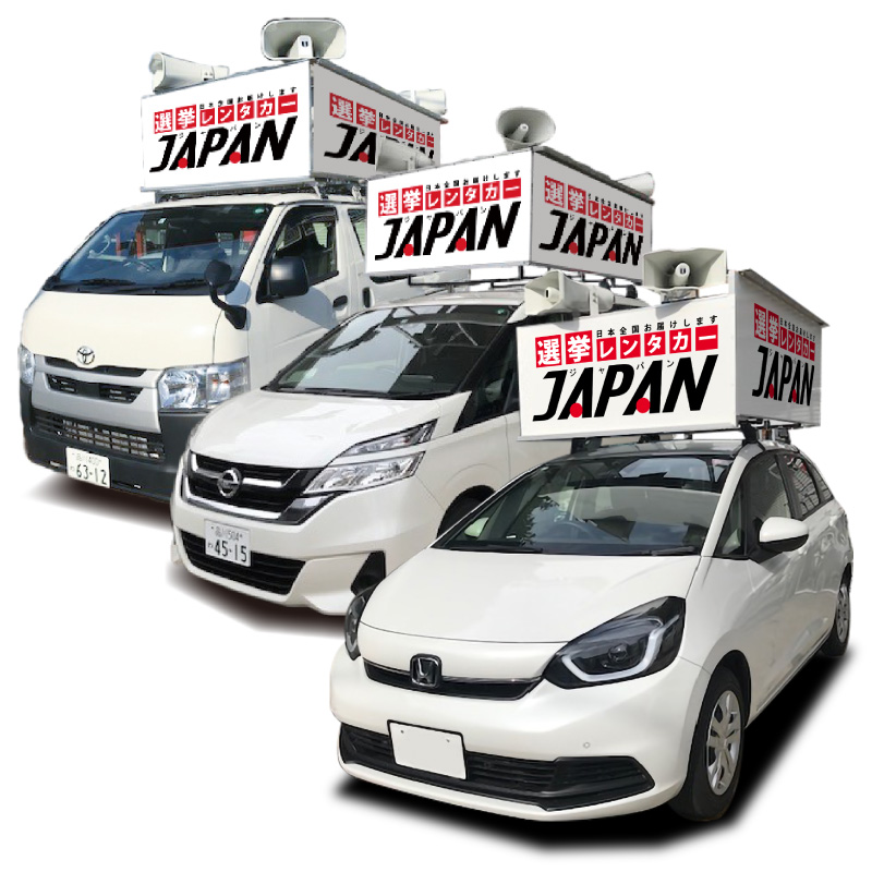 新車5年以内の高品質な選挙カーを、選挙看板・音響設備・各種申請や引取納車までオールインワンパッケージにして提供しております。